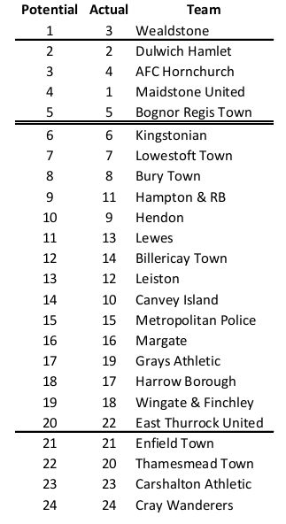 With so many teams having played different numbers of games, it is hard to really see what the true league positions should be. Lewes had dropped down the table from 7th in late November to 12th before this game, both as a result of a serious lack of games, but also due to drawing six of the eight games in that period. So what would the real league table look like if we had been able to play all of the scheduled games? Well thanks to my complex financial modelling I can now exclusively reveal what the true Ryman League table would look like.