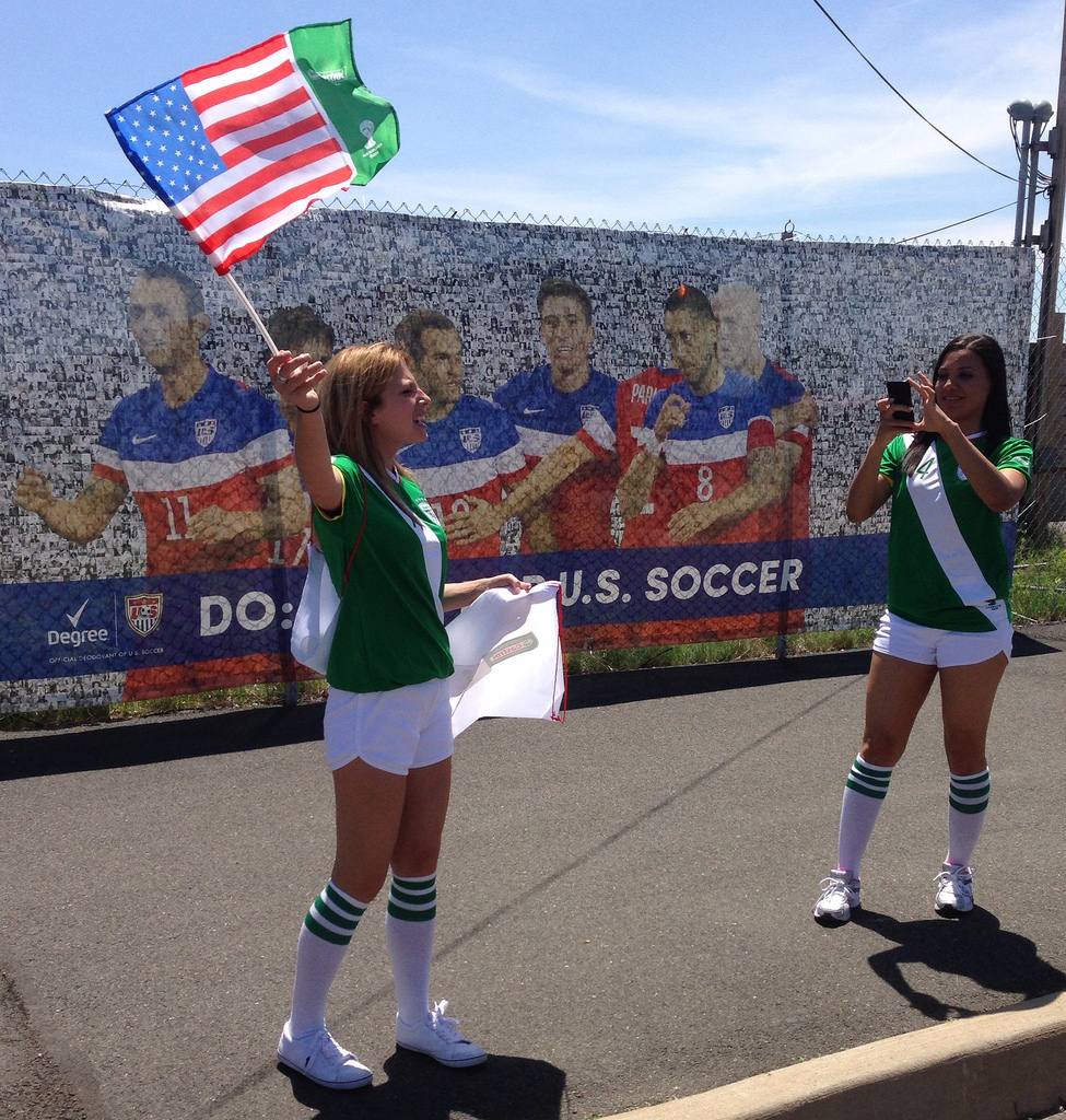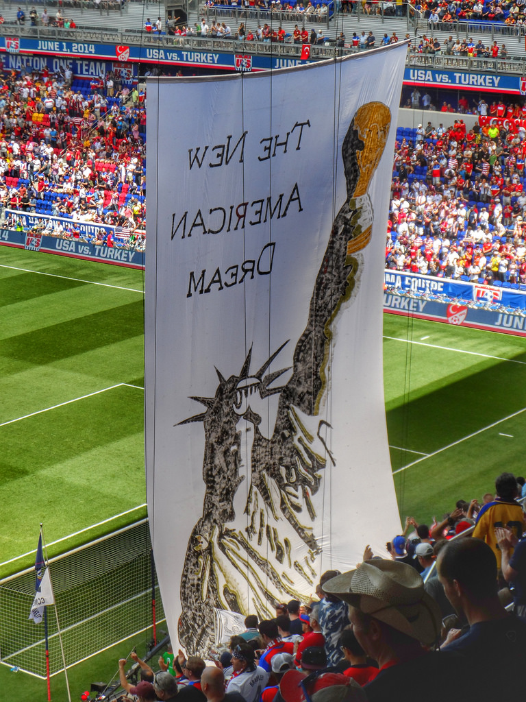 The fans were certainly out in force. I was very disappointed not to see anyone dressed as Uncle Sam, Bill Clinton or The Statue of Liberty and as we entered the stadium nor being given big foam hands with “USA, Number 1” on. Instead we were faced with queues a mile long for beer on the concourse. The US population is wising up and their palette is maturing. We could have bought our 2 pints of Coors Lite (with ID of course) without any queue at all but who wants that these days? It’s all about Goose Island, Honkers Ale or Patriot Ale. Twenty minutes later, and three Nathan’s hot dogs later we had our beers and headed up to the seats just in time to see the teams emerge at 2.03pm (once again, kick off time in the US simply means what time the teams may come out of the tunnel).
