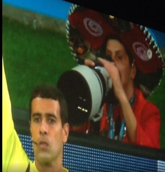 2. Photographer with the hat – 16 minutes in and Algeria attack again. What a cross from El Arabi Soudani, Islam Slimani gets ahead of Jerome Boateng to fire in a low header in off the post. Alas he is offside and we get a close up of the linesman raising his flag. But hang on. The photographer behind him is wearing a Mexican hat. A bloomin’ big green wide brimmed Mexican hat. Arriba, arriba, andale, arriba! (thanks to Dan Campbell for sending me a screen shot).