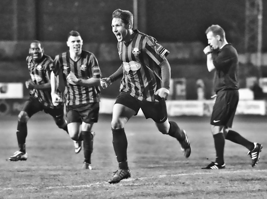 Due to an issue with the PA system I’m having to watch the game from the office, which doesn’t quite afford views of the goal line at the Philcox Stand end. So I see Davis strike the ball, the wall jump, the ball go under them and then…..the cheer. I high-five Club Sec Kev, do a little dance around the room and then remember I am supposed to do the announcement. I’m using the emergency speaker system, meaning an airport style “bing bong” every time I have to say something. It’s pointless really, the crowd are still bouncing up and down and wont hear a word anyway (Great picture capturing the moment from the genius that is James Boyes)