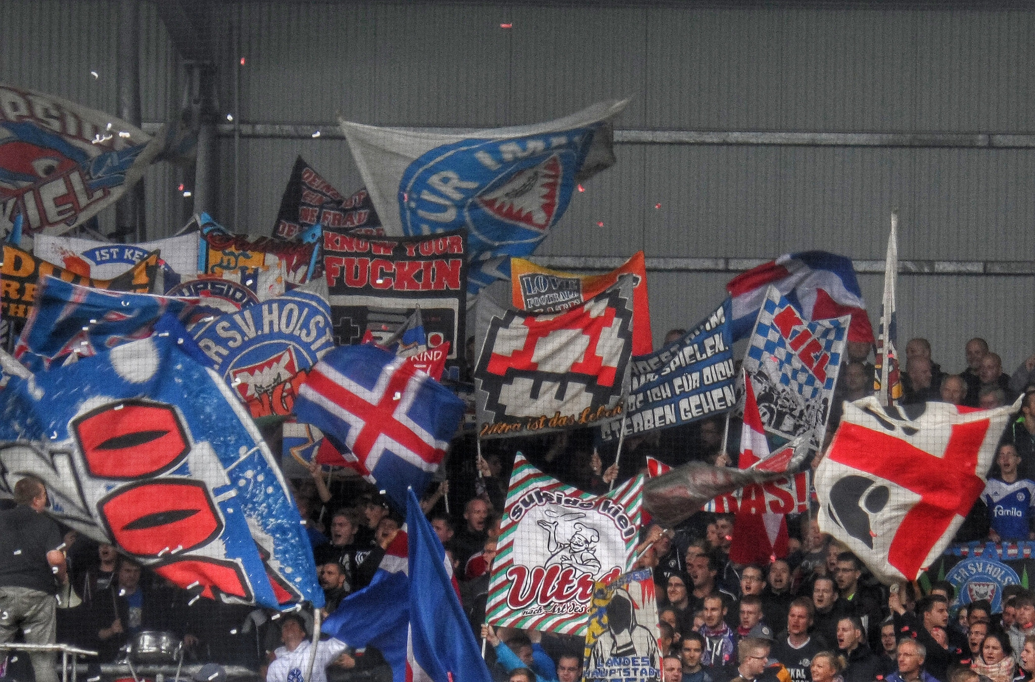 The Pokal is taken very seriously in German Football. None of this putting out the reserve/kids XI out – clubs take it very seriously. Bayern Munich, arguably the best team in the world, want to win it every year – why wouldn’t they? The rules means that the lower-ranked team plays at home, with no replays. When the draw this season was made, 3rd tier Holstein Kiel were to host 1860 Munich – a near one thousand mile round trip. But, without any surprises, the game was a sell out with nearly a thousand 1860 fans making the journey to bring their colour, songs and bad dress sense (well, a few anyway) to the famous port city in Northern Germany. The home fans did themselves proud on and off the pitch with a riot of colour, flag waving and singing. Oh, and beer. Lots of beer.
