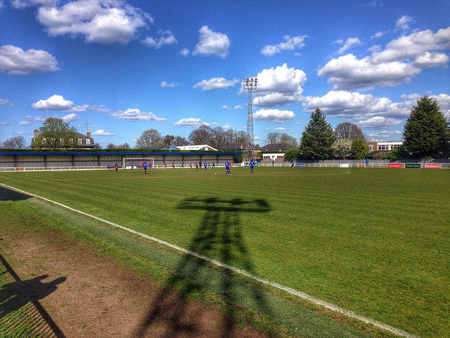 We came in hope rather than expectation, enjoying the sunshine for the second away trip in six days, and once again provided a large proportion of the total attendance. In this case it was 37 fans out of a total of 85. It is hard to believe that it is still possible for Met Police to be playing in the Conference South in just a few months time, with this win doing their late play-off charge no harm at all. Yet, no more than a few dozen fans come to watch them. You can’t fault the facilities at Imber Court, although the strict rule that guests had to be wearing a jacket and tie to enter the board room (in theory you could wander in wearing shorts and flip-flops as long as you had a tie and jacket on) does seem quite formal for the confines of the Ryman Premier League. Fortunately, a board member, seeing my predicament, or mores to the point, Club Sec Kev taking the piss because he could go in and I couldn’t, came out with a plate of sandwiches for me.