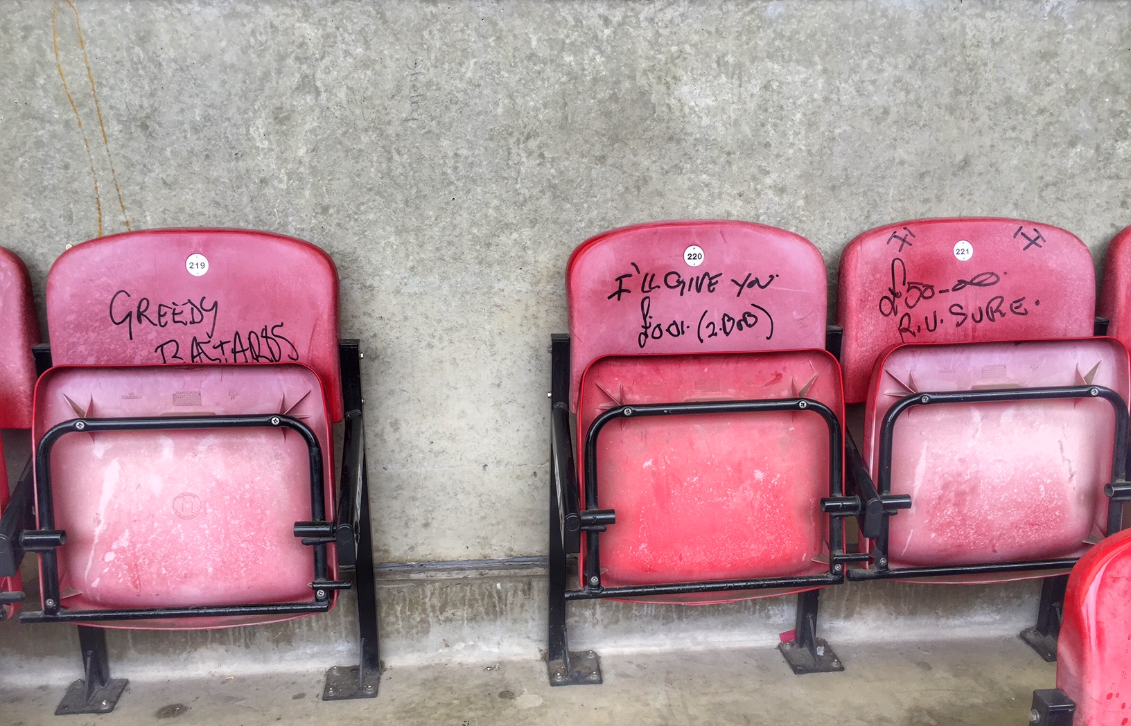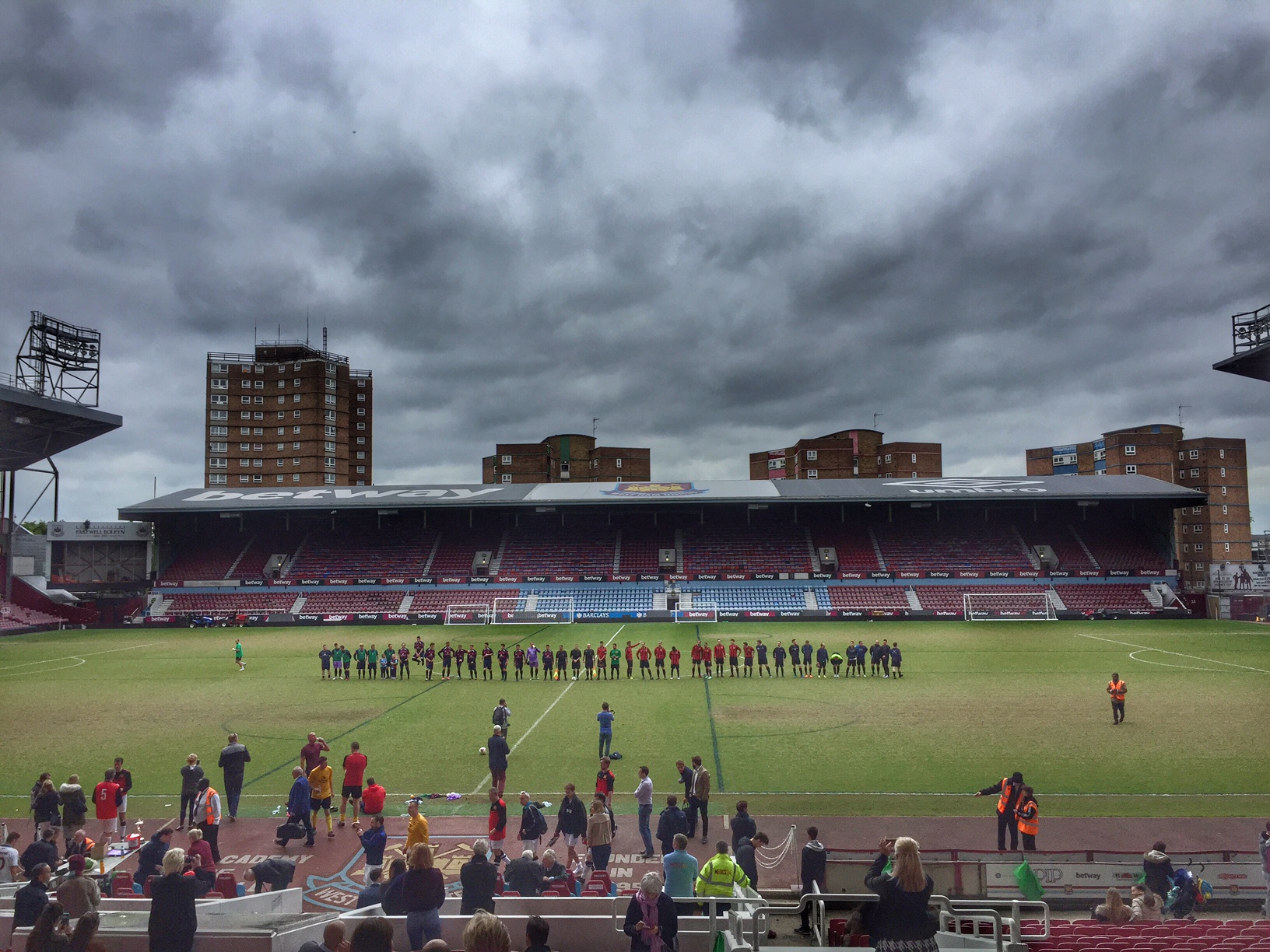 At first glance it appeared this was a wind-up. There was no game on, nor did it appear that there was any life in the stadium at all. A group waited outside the main entrance for their tour to start but then I spotted an open door on the corner of the Main and Sir Trevor Brooking Stand. No signage, no stewards, no posters – just an open door. Once inside the inner-sanctum of the Main Stand I paid my money for the charity programme and took a seat just as the two teams came out for the first game. It was surreal to say the least. Around 100 spectators were spread across the lower tier of the Main Stand. The constant sound of drills from the Bobby Moore Stand filled the air as the club had begun to remove them, with fans having paid £50 for a bit of old plastic. Every possible sign in the stand, such as on the toilet doors had already been removed, as too had the big screens in the corners, in preparation for the final public event, the grand auction (only £25 to get in by the way) being held next weekend.
