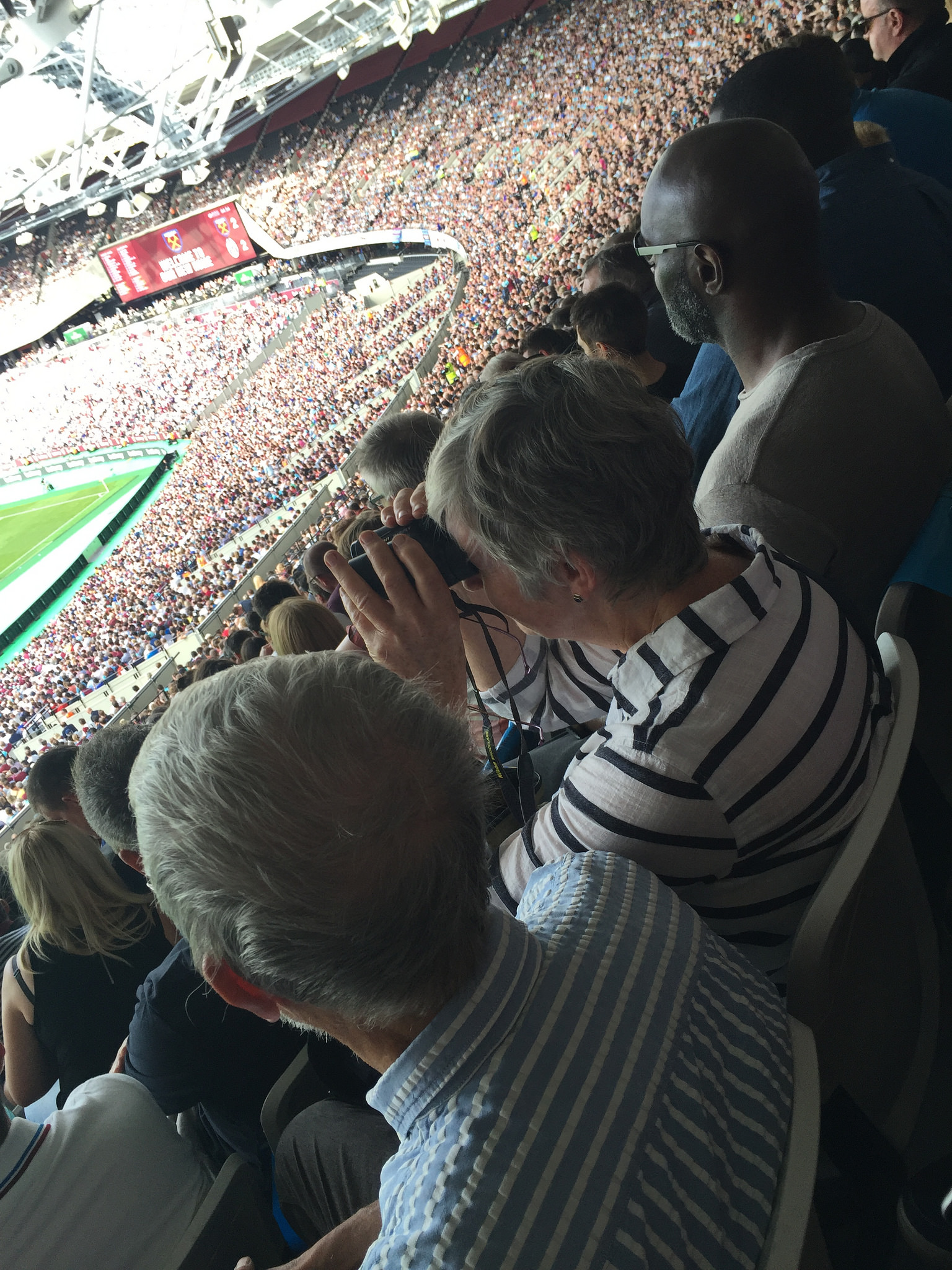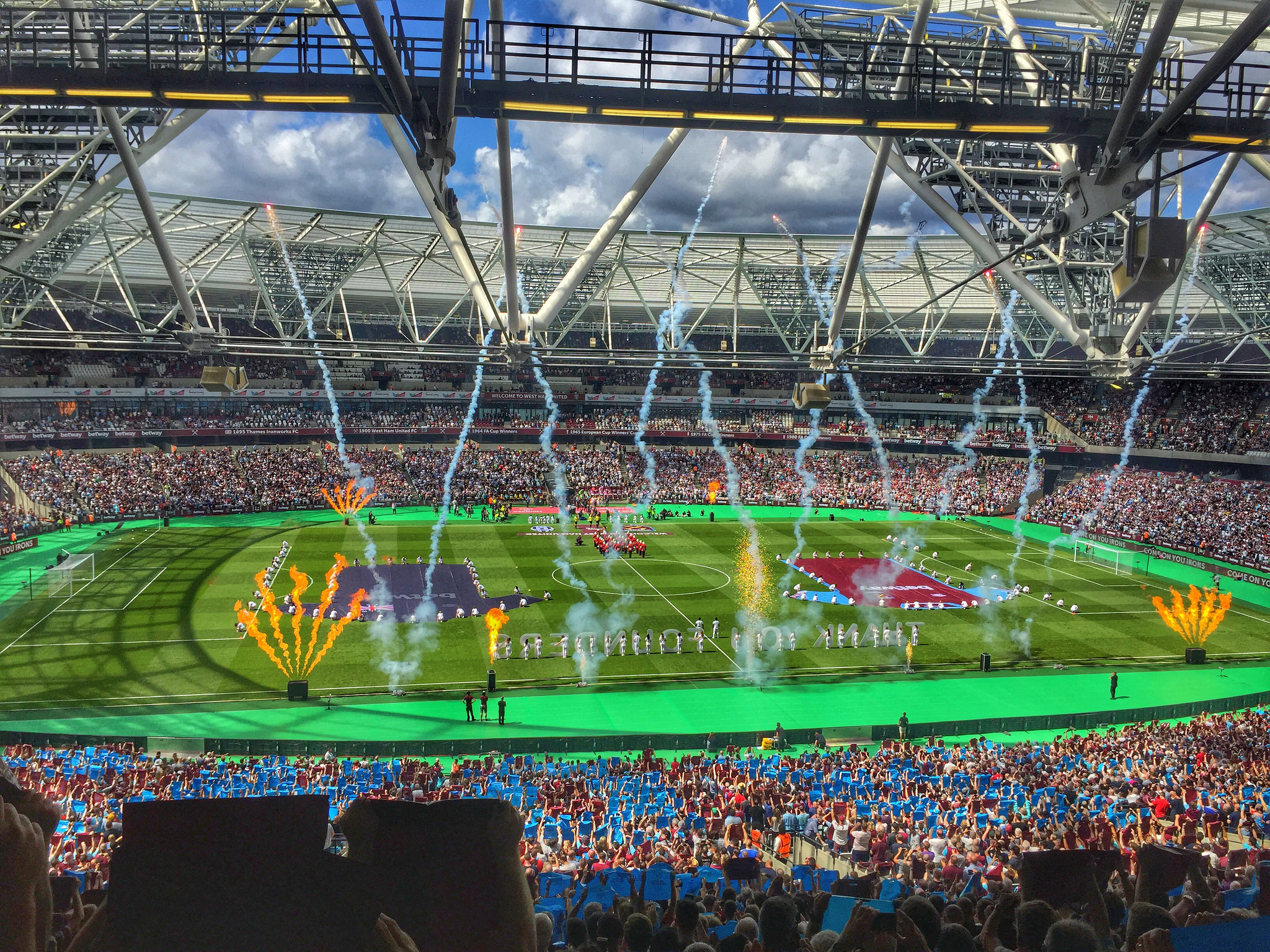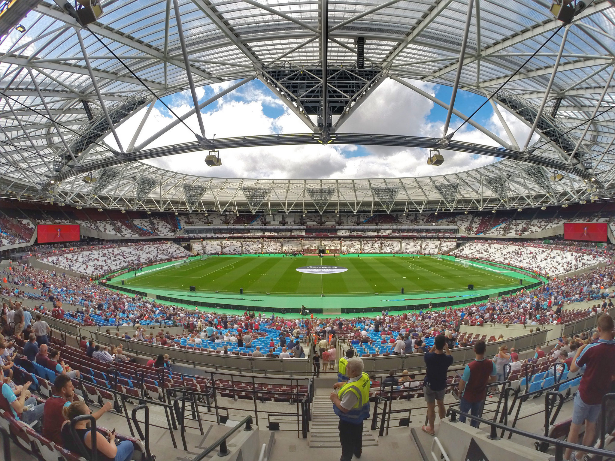 The stadium certainly looked magnificent from the outside. The “wrap” around the perimeter featured some of the current squad, which is a bit dangerous as and when they may leave, as well as silhouettes of various players such as Noble and Payet. Entry was painless but then you hit the first issue. The queues for food and drink stretch along the concourse, meaning as you enter you have to negotiate through a line of queuing fans.