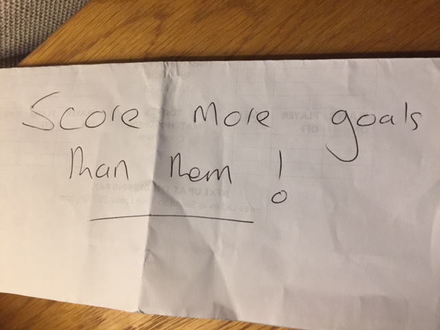 Which technically meant when the officials came into the bar for their pasta post-match, Darren couldn’t even go and shake their hand and say “well done” although he resisted passing me any further notes. Normal service will be resumed in two weeks time thankfully.