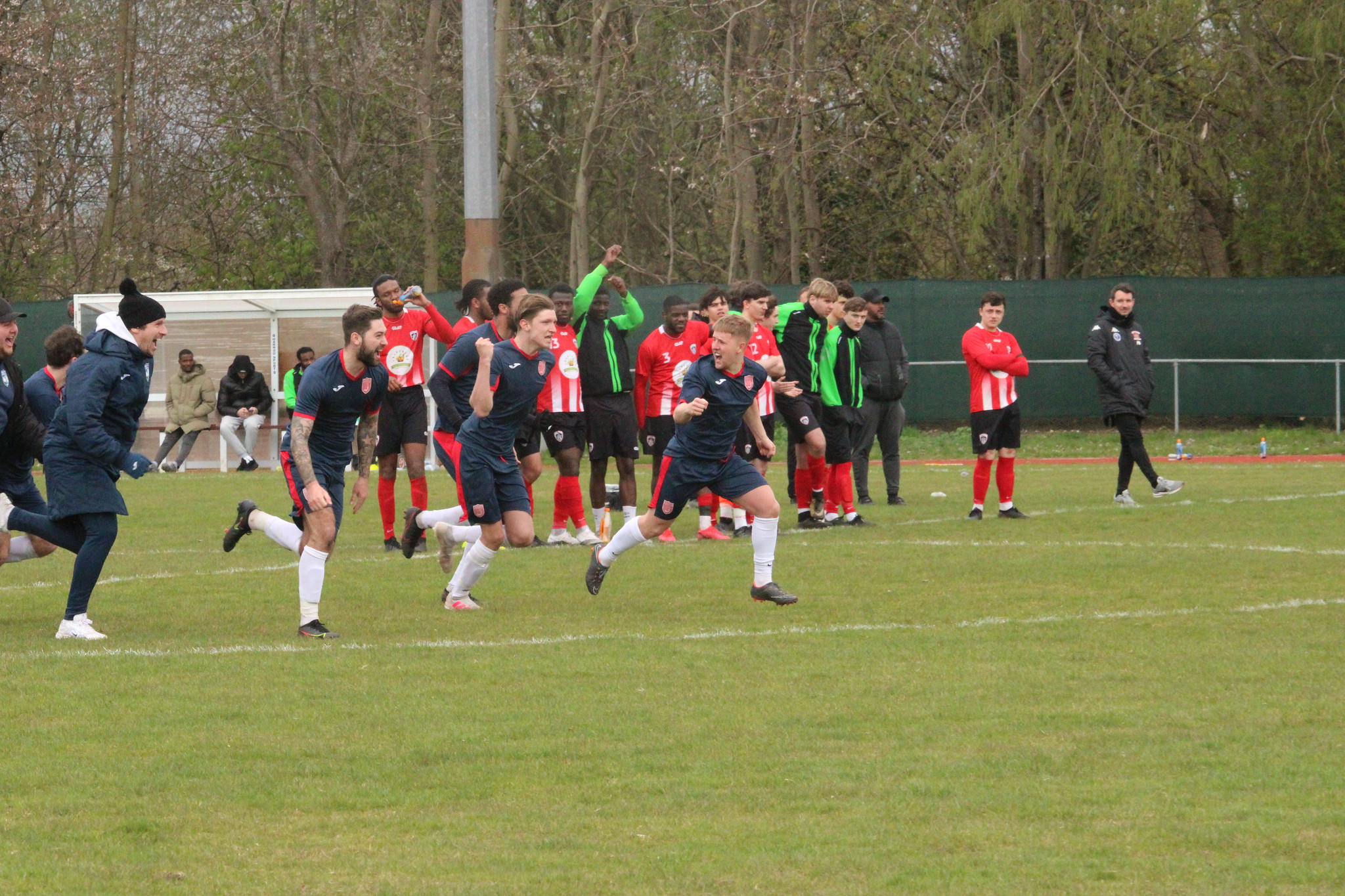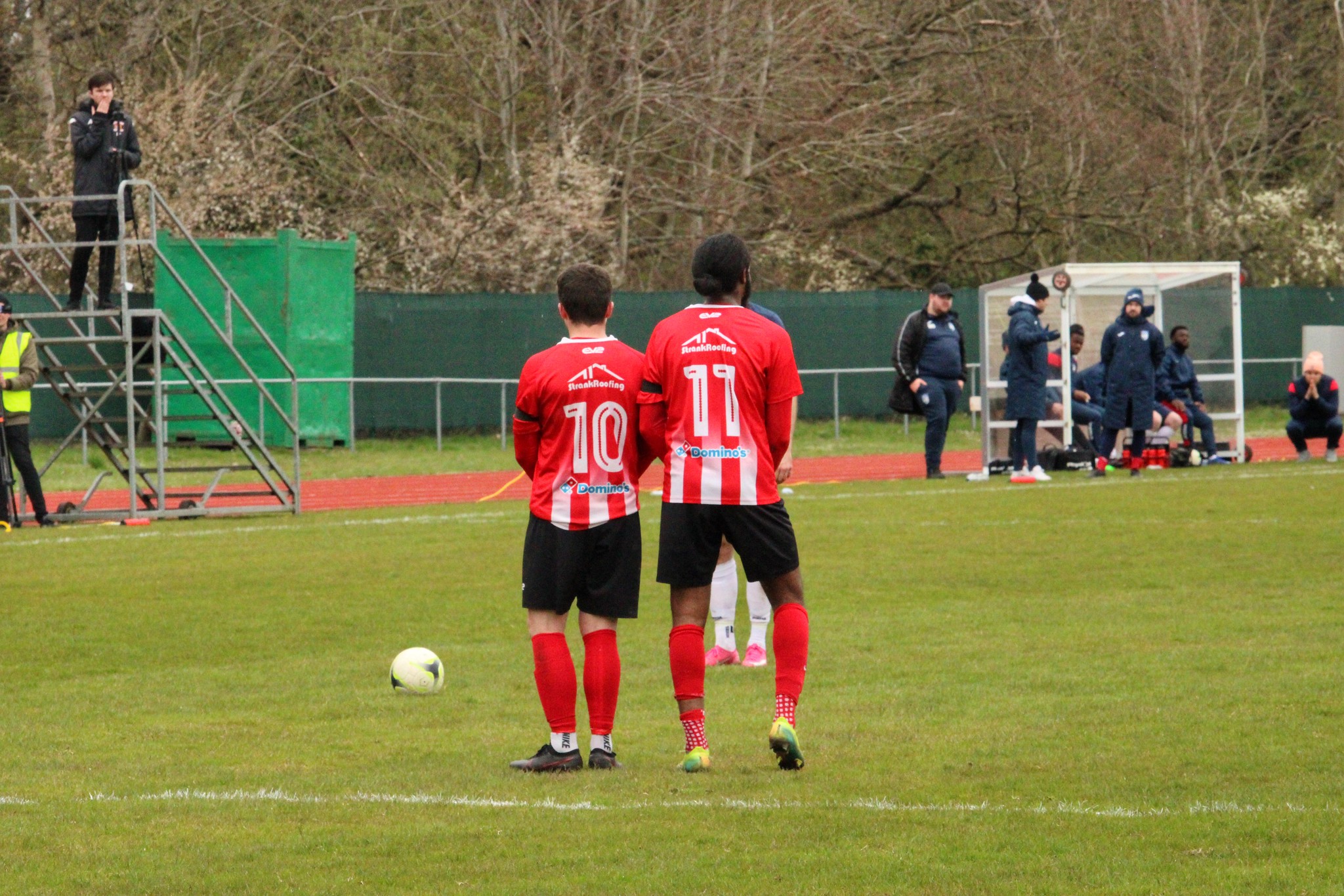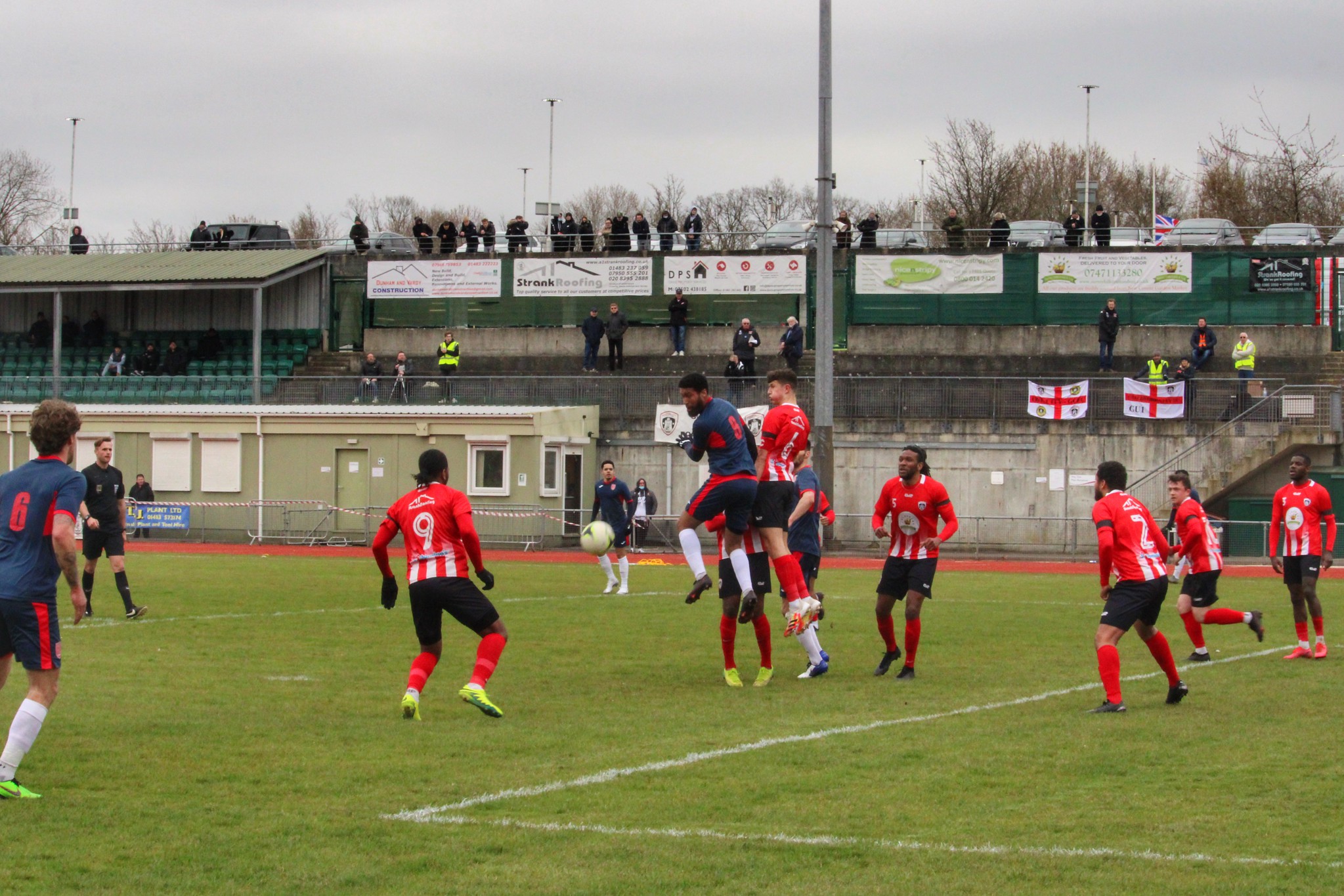 Guildford City’s home ground, The Spectrum, is part of a complex that includes the leisure centre. Due to the layout of the site, the car park overlooks the ground which had led to a a couple of groups of fans standing outside but getting a perfect view of all the action. Such are the crazy rules of the route out of lockdown that they were able to stand shoulder to shoulder outside the ground, but inside the athletics stadium with wide expanses of open space, it was volunteers and club officials only. There appeared to be more fans outside looking in than were in the stadium.
