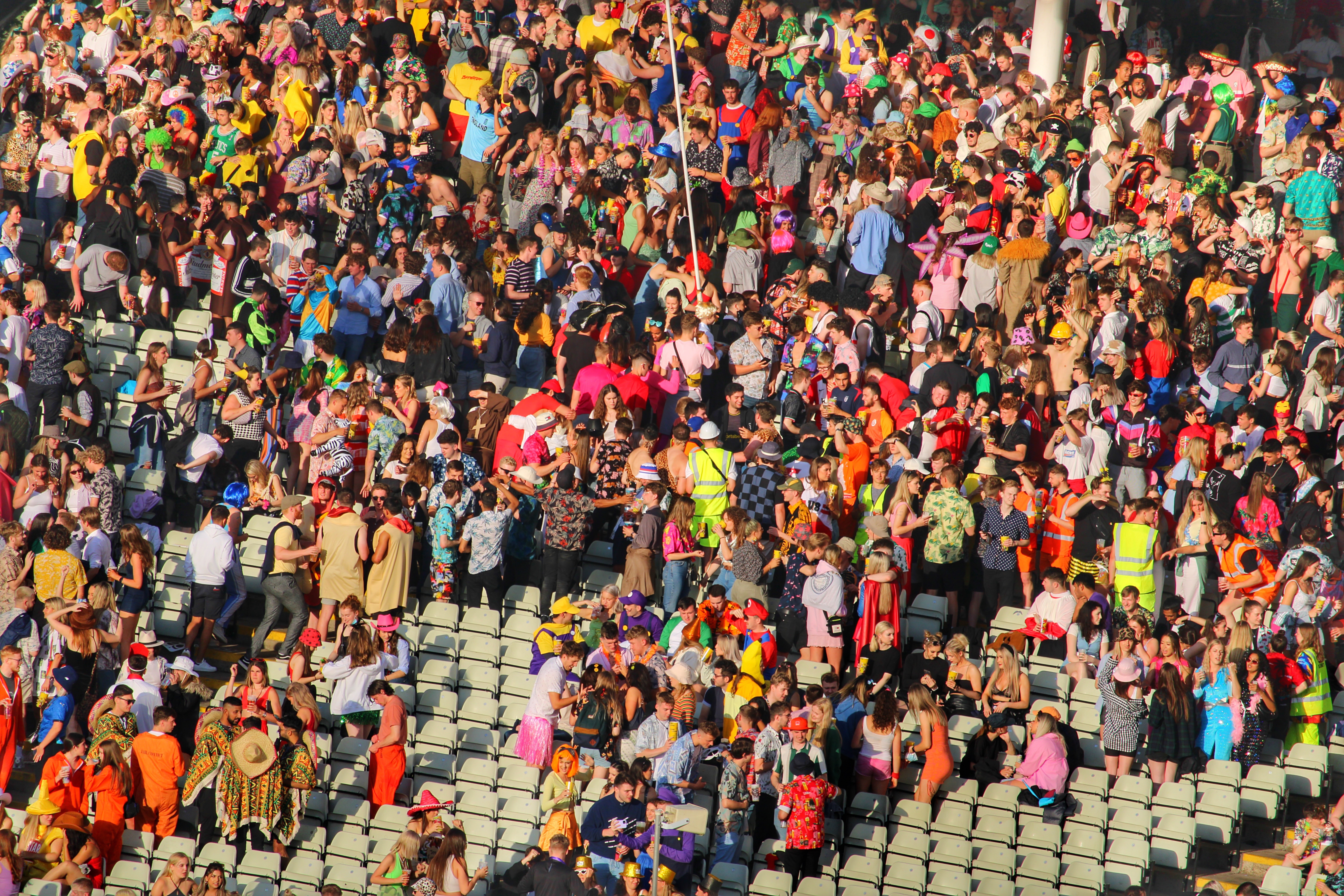 Our seats in the Skyline terrace afforded us a decent view of what was going on in the stands and at the crease. Whilst times change, fads come and go, celebrities pass in and out of the spotlight, most of the fancy dress has stayed the same. Super Mario Bros, The Simpsons, Vicars/Priests/Nuns, traffic cones, those annoying blokes from the 118 ads (does anyone under the age of 25 still remember those?). There was a Boris Johnson, although he looked more like a very slim Donald Trump and a group of hotdogs, with two girls dressed as ketchup and mustard bottles.
