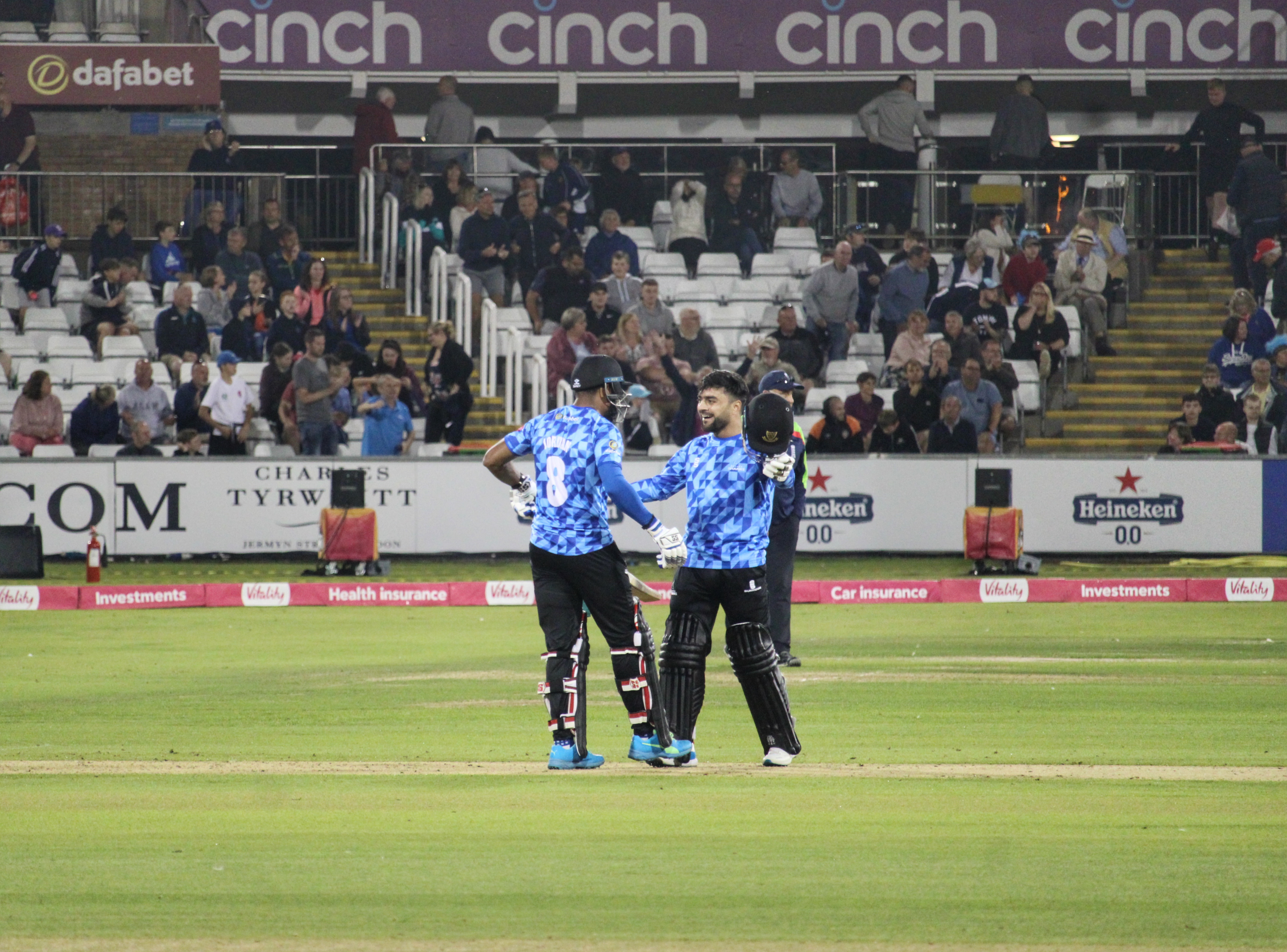 The pressure was now on the middle order to deliver as the overs counted down. When David Wiese departed for 19 the Sharks were 156-5 with 12 balls to go. 22 needed but with Rashid Khan and Chris Jordan at the wicket – the odds were in Yorkshire’s favour but then Khan hit three consecutive fours in the middle of the 19th over and all of a sudden the total was down to just six off six balls. Two well-taken singles before Jordan’s drive beat the in-field and Sussex had won with two balls to spare. The celebrations were understandably wild. The Sharks were the underdogs and they had pulled off a fantastic run chase.