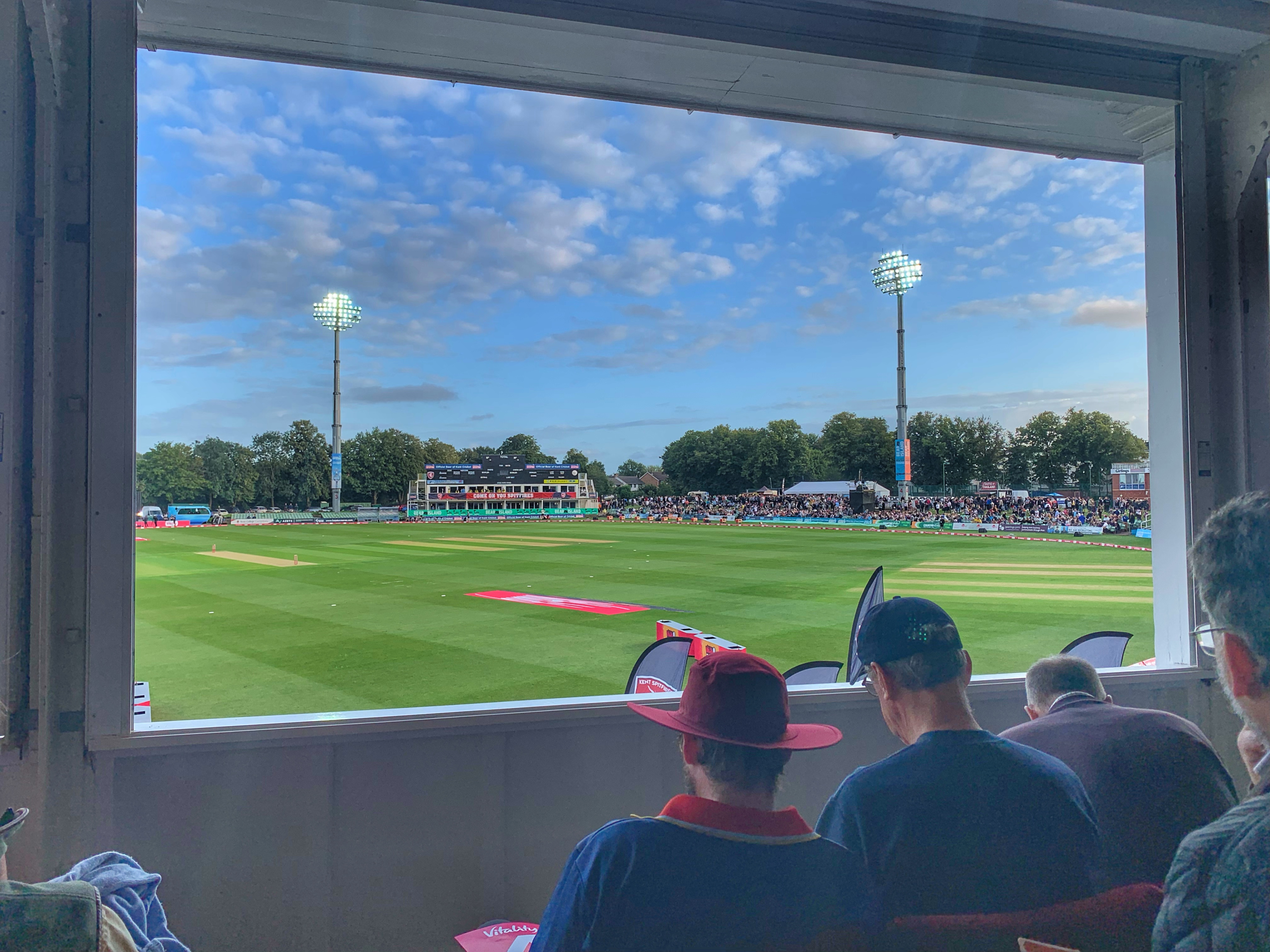 Our seats were in the upper tier of the very quirky Underwood & Knott stand, squeezed in beside the home team pavilion. It is a very intimate affair – 8 rows of 18 velvet cinema style seats, with heavy framed windows that gave the impression you were watching the game on TV, which is exactly what the Current Mrs Fuller had to do as the thick window frame in her eye line obscured the wicket completely.