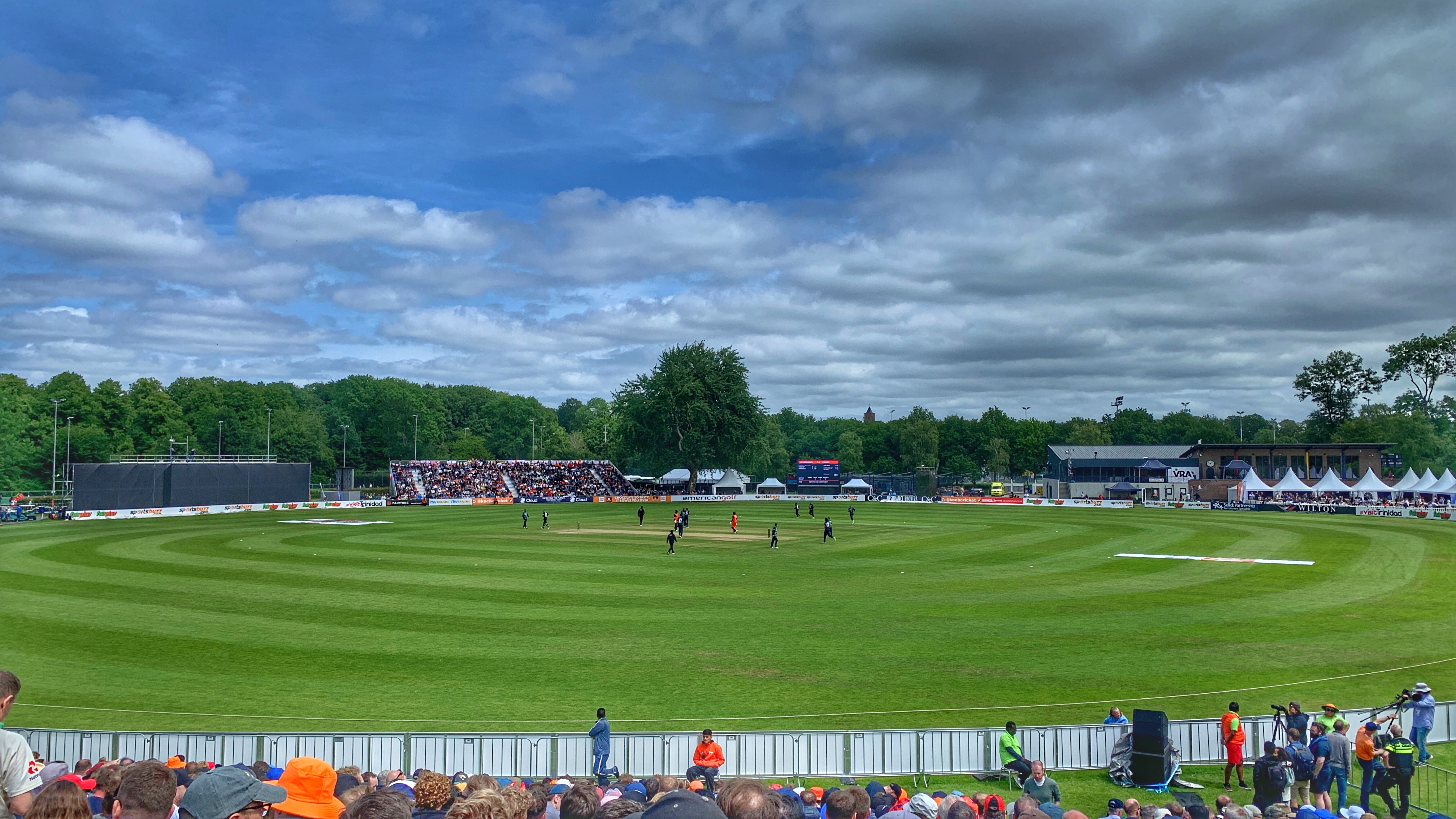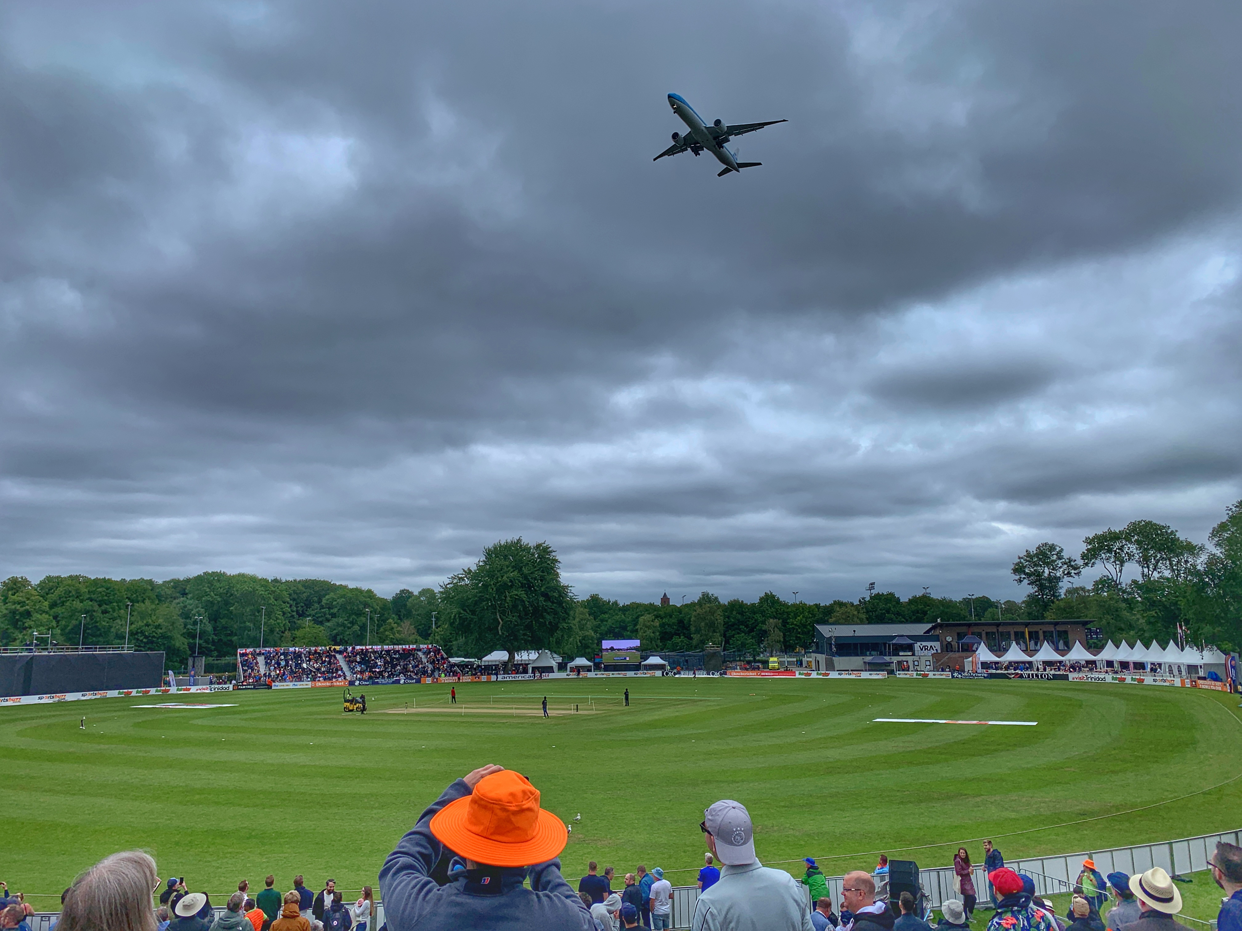 A 4am start on Sunday morning was necessary for making it in time for the start of the second game in the series. Bad news, airport chaos at both Gatwick and Schiphol meant a 90 minute delay. Good news, hotel overlooking the Olympic Stadium (yep, the stadium used for the 1928 Summer Olympics) allowed us to check in early. Even better news, overnight rain had seeped under the covers and the start was delayed until 1pm which meant a 41 over a side game.