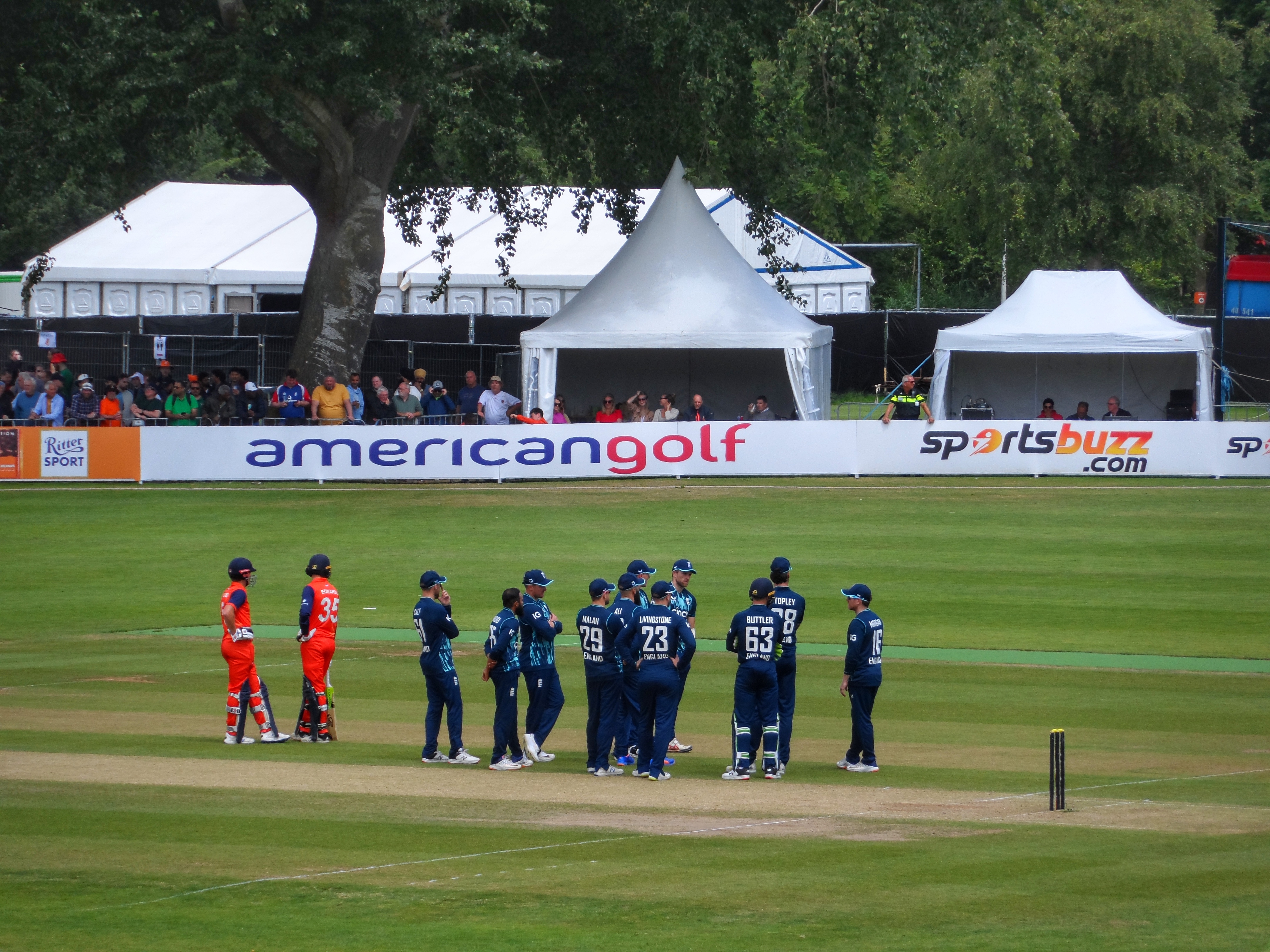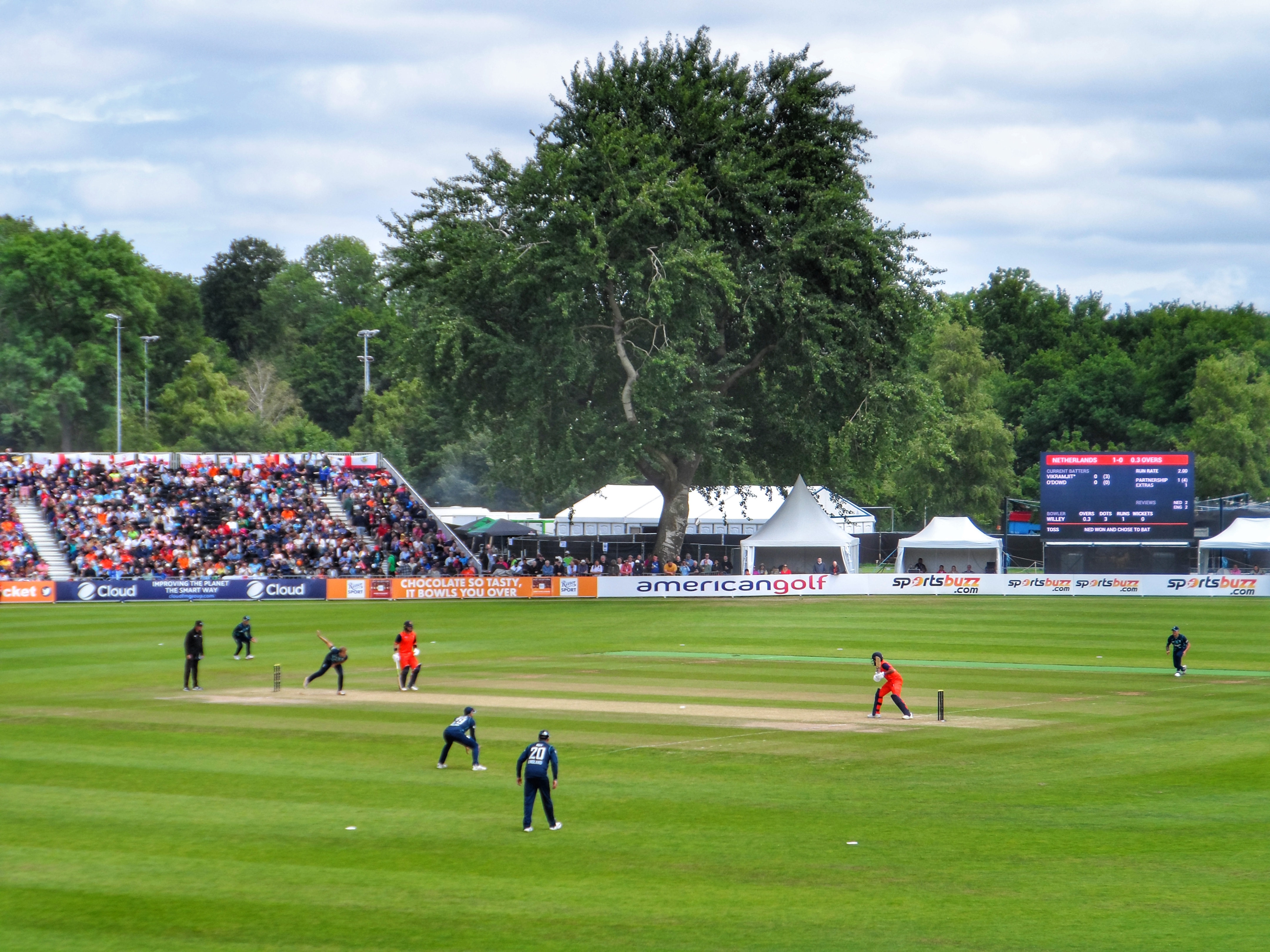 Finally, at 1:20pm we were ready to start. The Dutch had won the toss and decided to bat first. Whilst this England team was built for batting, they can also bowl economically and after 10 overs the hosts had reached just 39-3. As you would expect there’s some very un-Dutch names in the Netherlands team these days. Vikram Singh, Max O’Dowd, Tom Cooper, Tim Pringle, Shane Snater. Tongan Scott Edwards took the attack to the England bowlers, scoring 78 off 73 balls, including three huge sixes before he was run out, ably supported by de Leede, Nidamanuru and van Beek who took the run rate up to nearly six an over.
