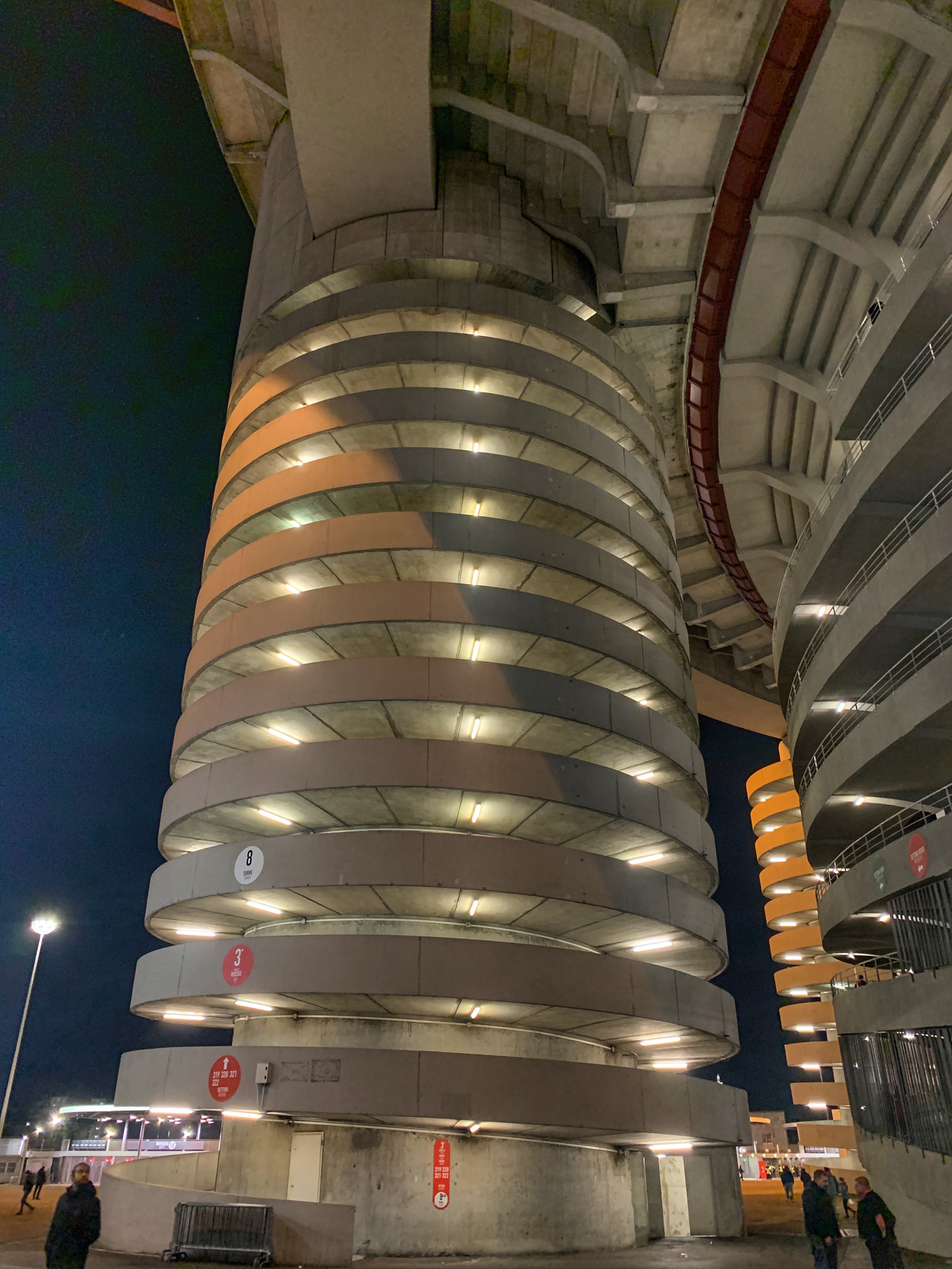 If, like us, you think in normal English football fans terms about rocking up 10 minutes before kick-off and being in your seat before the game starts then don’t. Fans tend to arrive around an hour before kick-off, savouring the show put on by the ultras in the middle tier of the South (Blue) stand. Sure, we had no delays in going through a security check, having our passports checked against our tickets and negotiating very slim turnstiles but then we had to ascend the south face of the stadium. The good news is in those corner cylinders are ramps that gently climb up. The bad news is as the gradient is relatively low, you must do around 30 laps of the towers before you finally arrive at the concourse, eroding that 10 minutes we had on entering the stadium.