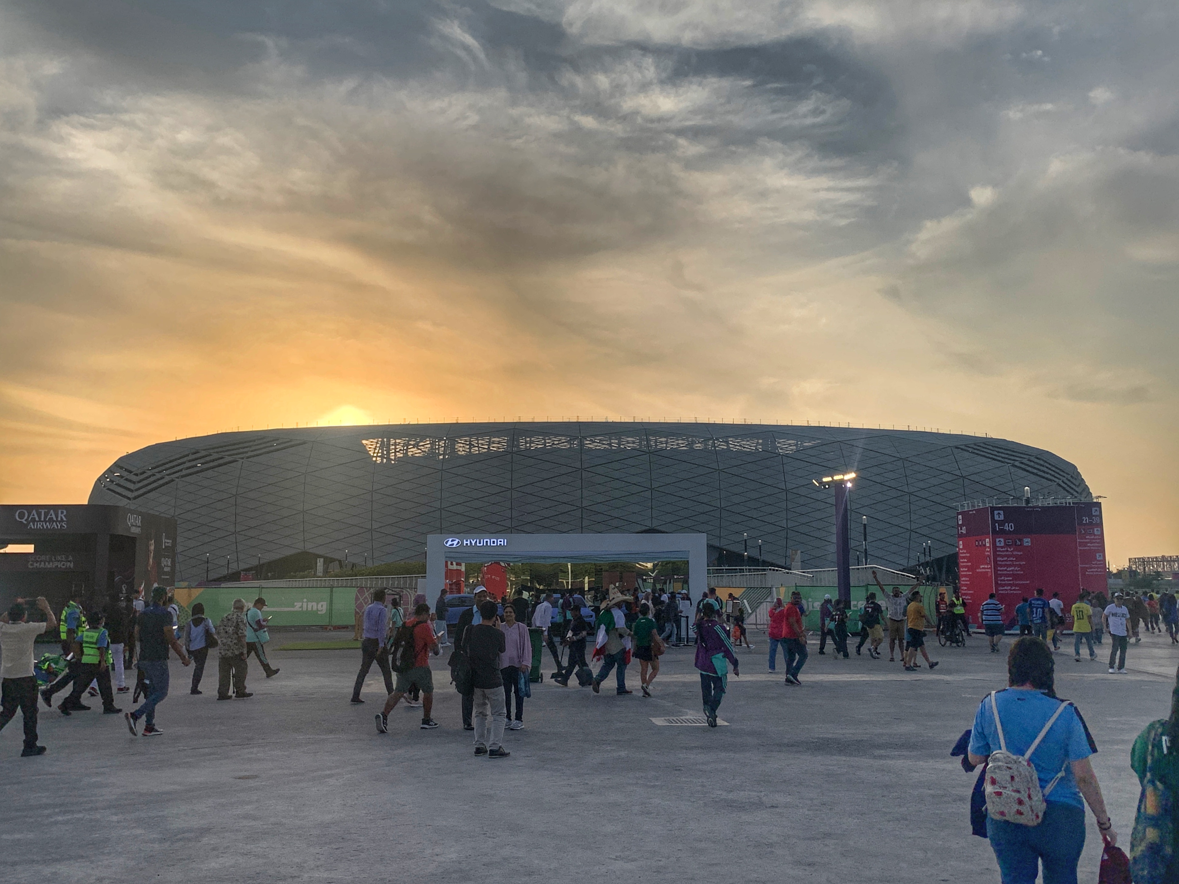 The stadium was certainly impressive as you approached it, sparkling in the setting sun. The official, FIFA description is that ‘the facade of the stadium features triangles that form complex, diamond-like geometrical patterns which appear to change colour with the sun’s movement across the sky. Like diamonds, the stadium’s design represents quality, durability and resilience – and will become something to be treasured, both for the memories it holds and its future value to the country.’ Quite.