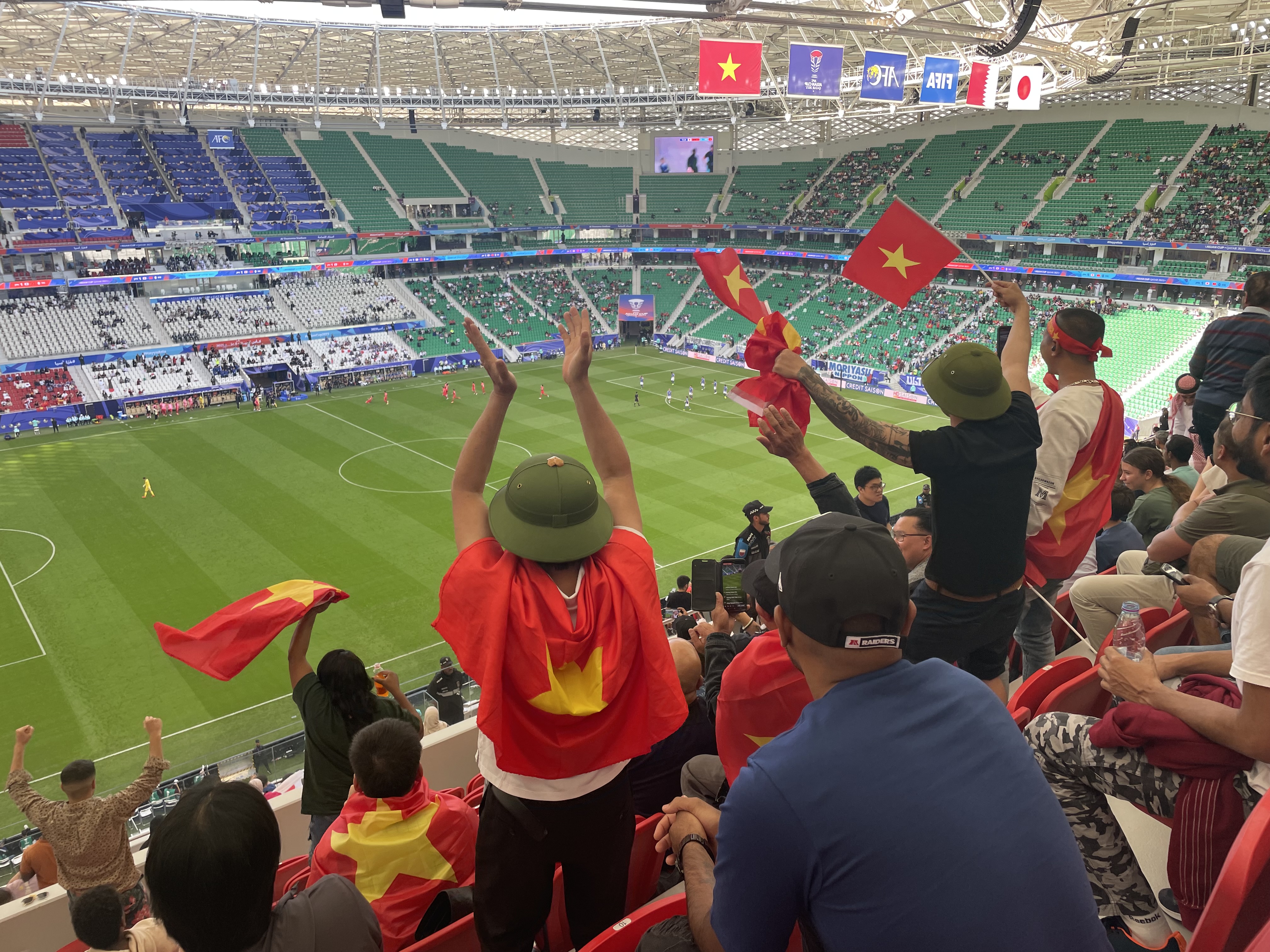 At the FIFA World Cup I’d attended the Qatar versus Senegal game at the impressive Al Thumama Stadium, which would be my first destination of the day for arguably the tournament’s favourites, Japan, take on world 94th ranked Vietnam. Described by those wordsmiths at FIFA as “A tribute to Qatar’s cultural traditions in the most literal sense, the stadium, situated in the Al Thumama district of Doha, features a latticed façade design that evokes the gahfiya—a customary head covering worn by males throughout the region”. They failed to say it’s in the middle of nowhere and public transport is a massive issue. Apparently, the stadium was supposed to have been reduced in size to 22,000 by now, but the decision to award the Asian Cup to Doha meant that it is still all in place.