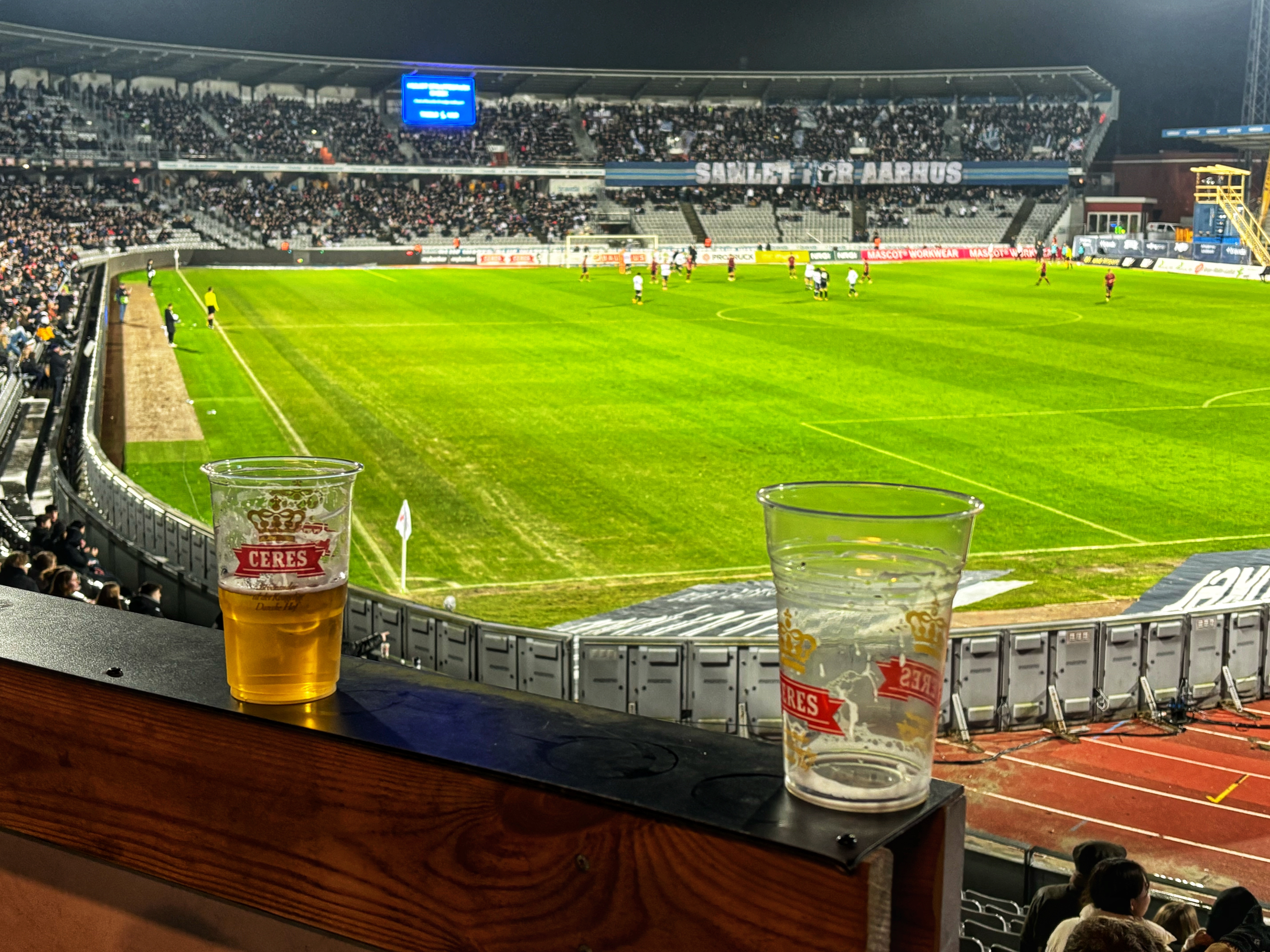 Rewind a couple of hours and I’d arrived from Vejle by train. I resisted the temptations of a cab, wanting to see a bit of Denmark’s second city. It’s a fair trek out to Ceres Park from the city centre but as darkness fell, AGF fans made their way on buses, bikes and on foot to one of the oldest stadiums in Denmark, first used for athletics by Aarhus Gymnastikforening, or AGF, in 1919.