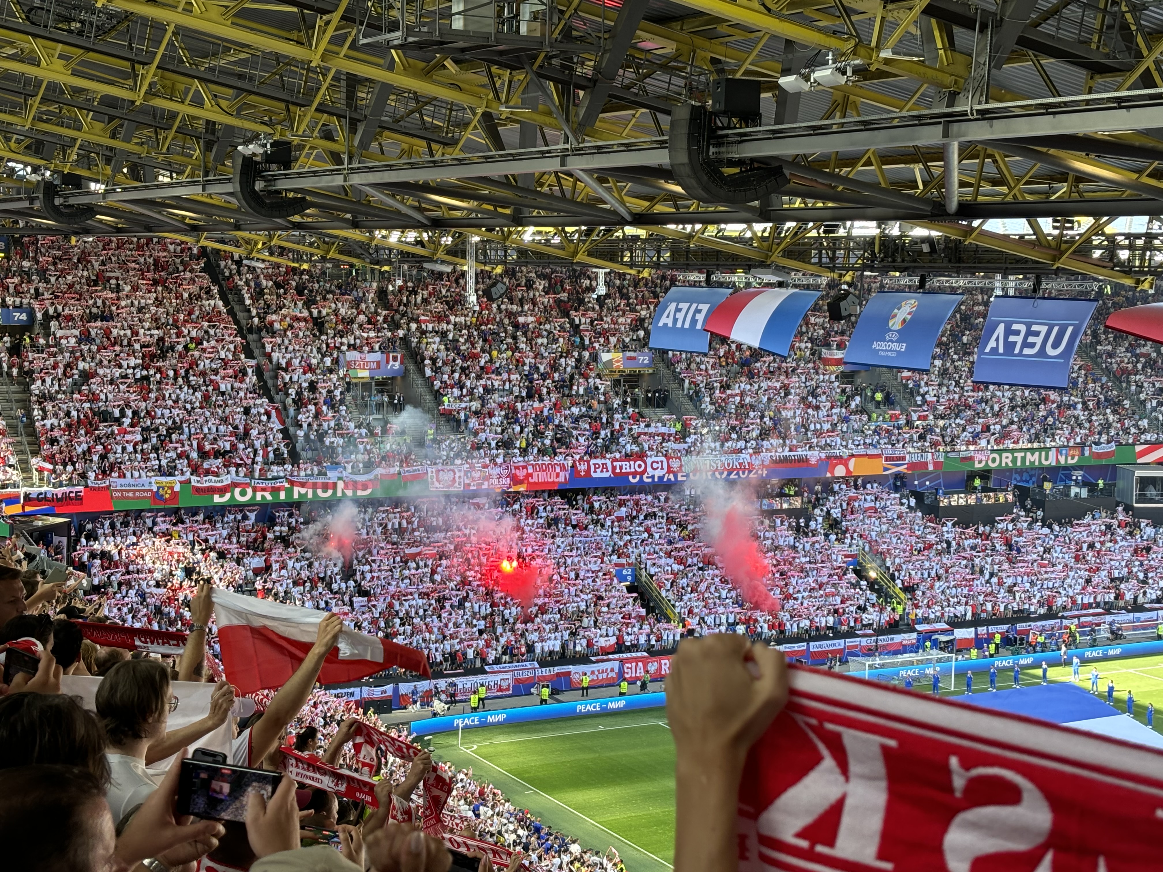 It was a sea of fans, heading in waves towards the biggest and best stadium in Germany. The nerves of attempting to use a ticket that originally belonged to someone else eased as I passed effortlessly through the checkpoints and I made my way up to the top tier of the west stand, with a bratwurst and a beer. Thankfully, the seat was shaded from the 32-degree heat, baking the French and Polish fans sharing the famous Dortmund South Stand Wall, one of the biggest terraces in world football, today converted into seating.